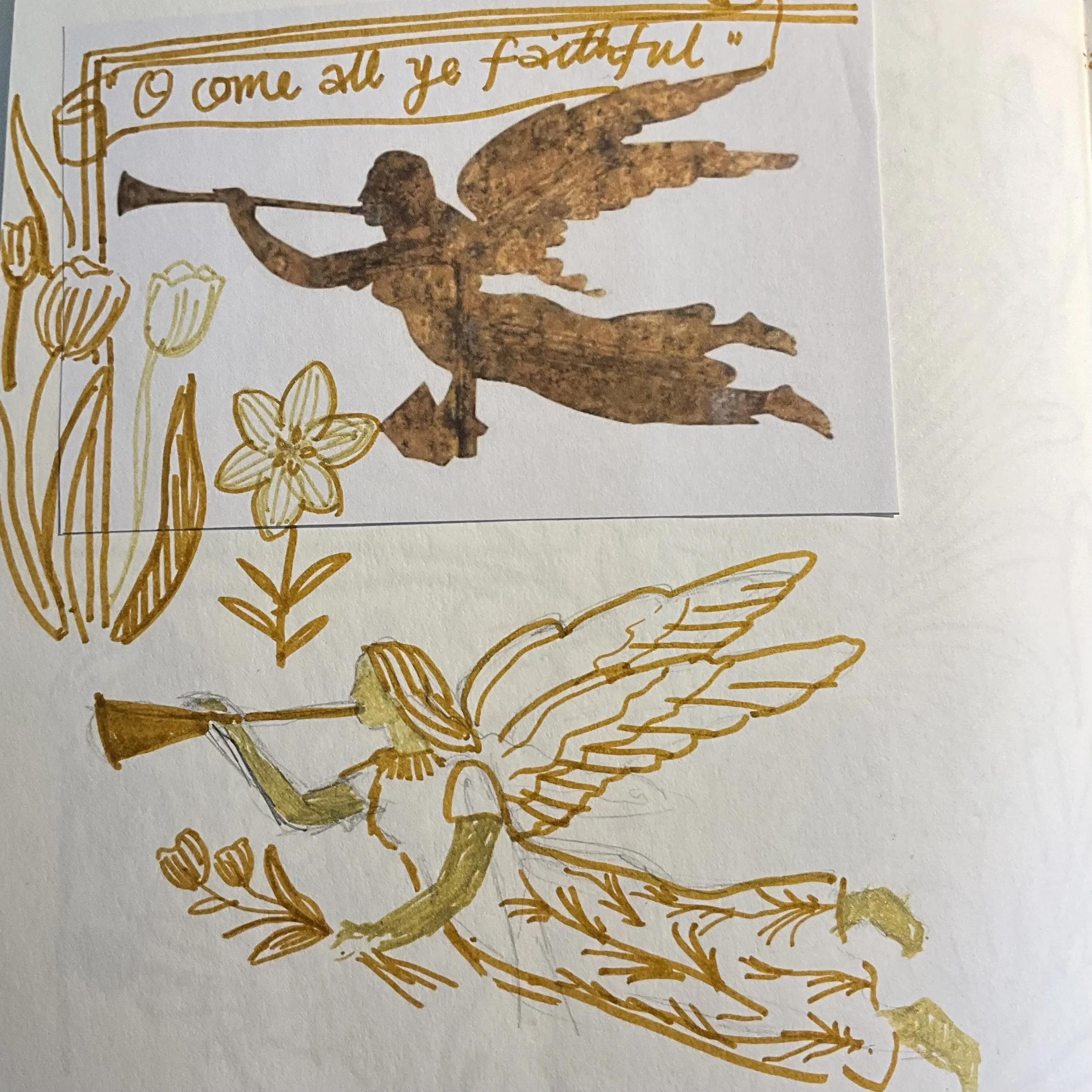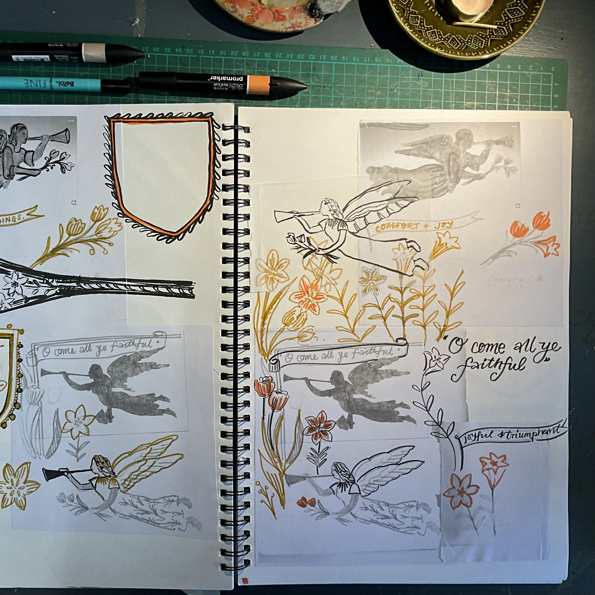 I thought you might like to know a little bit behind the Christmas Angel that we released earlier this month, and maybe have a sneaky peak at the preliminary drawings. If you’re new here, then it’s worth saying that every drawing starts with a hand drawn design, but these always start with some extremely rough designs in my sketchbook.