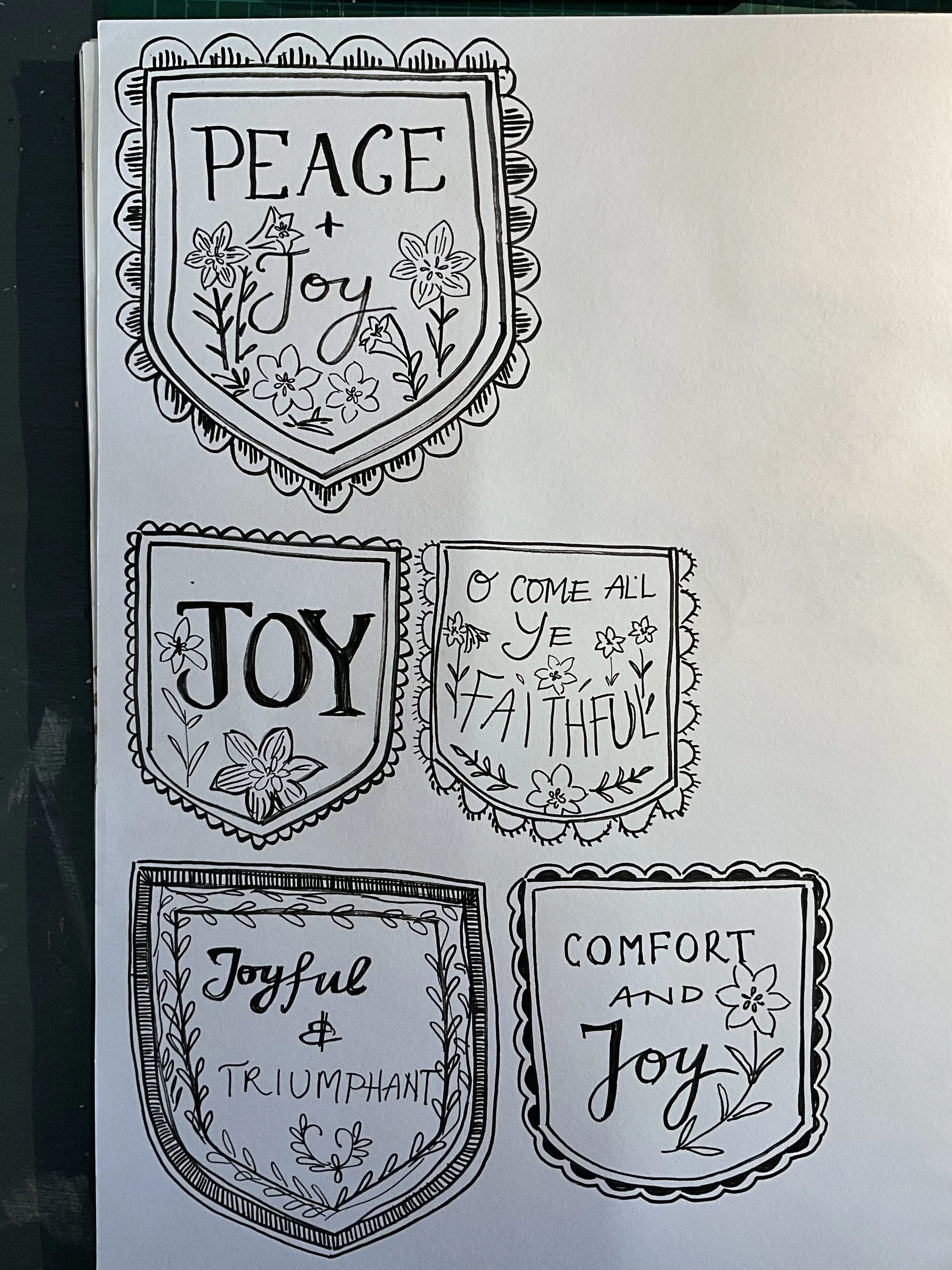 At this point I was still toying with the idea of adding text, to the design. I love some of the phrases of Christmas carols ( I loved being in a choir and singing at lots of Christmas carol concerts when I was at school). But I was also concerned that making phrases the size we needed for the scale of our candle carousel, they would look a bit lost or clumsy. So I parked this, and went with the floral tribute. the next step involved tightening up the line drawings and gleaning the parts of each angel I liked the most and combining them on Illustrator. I then cut and painted some samples, with Jenna so that we could get it just right, and replicate them.