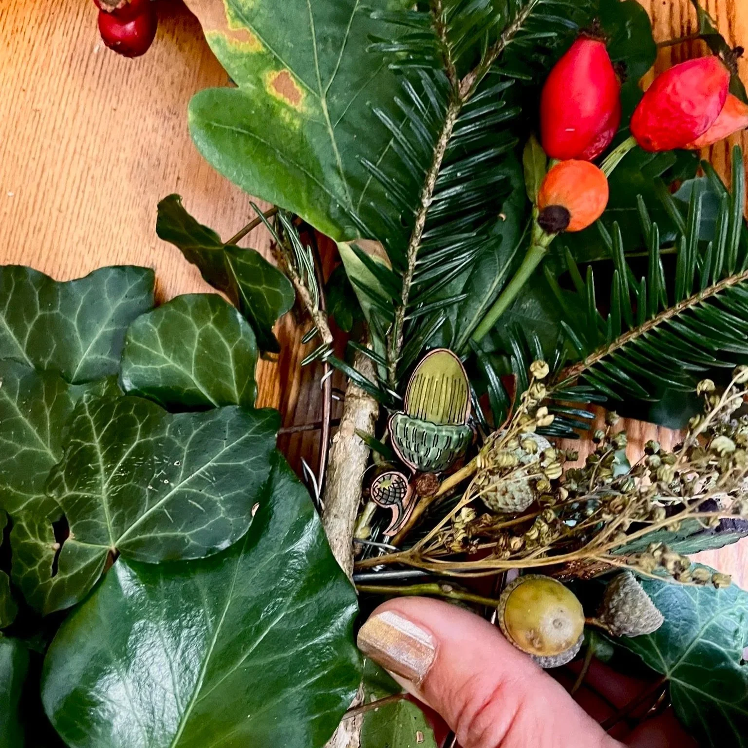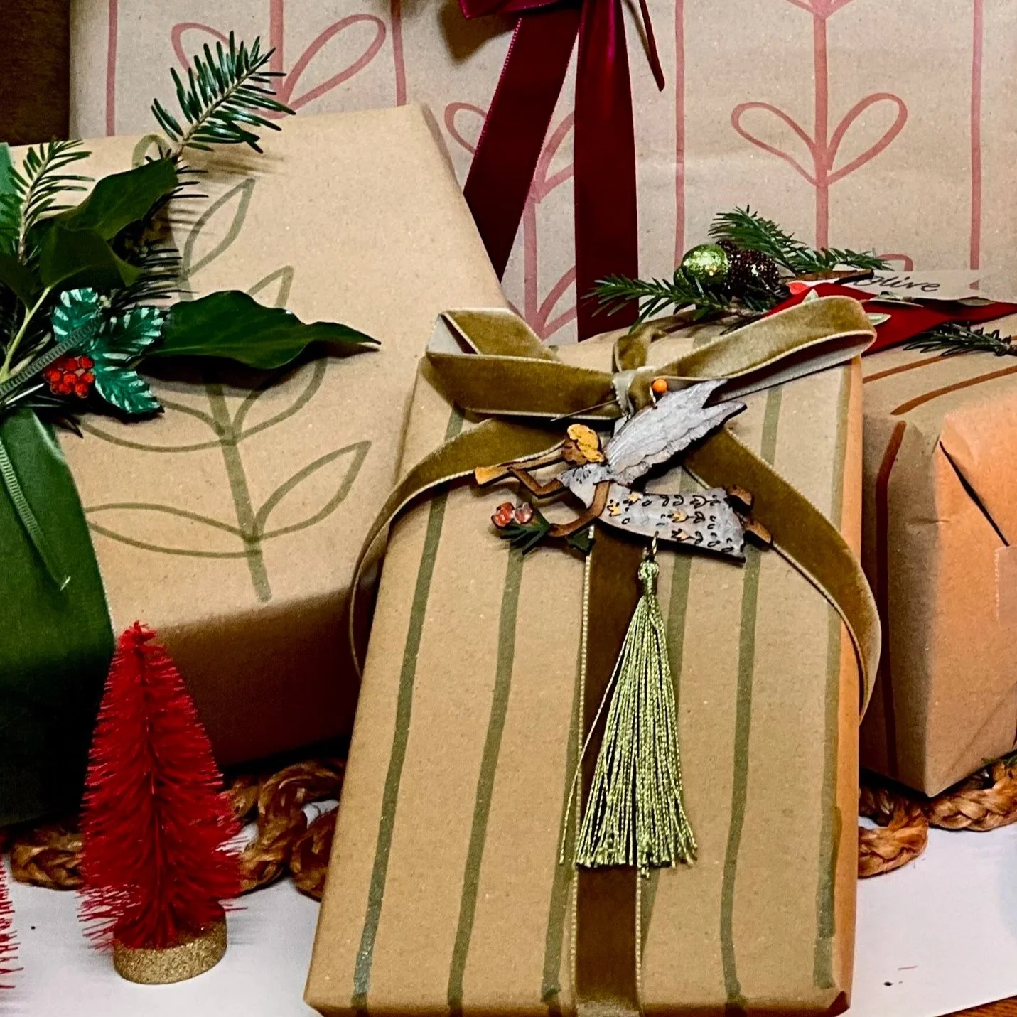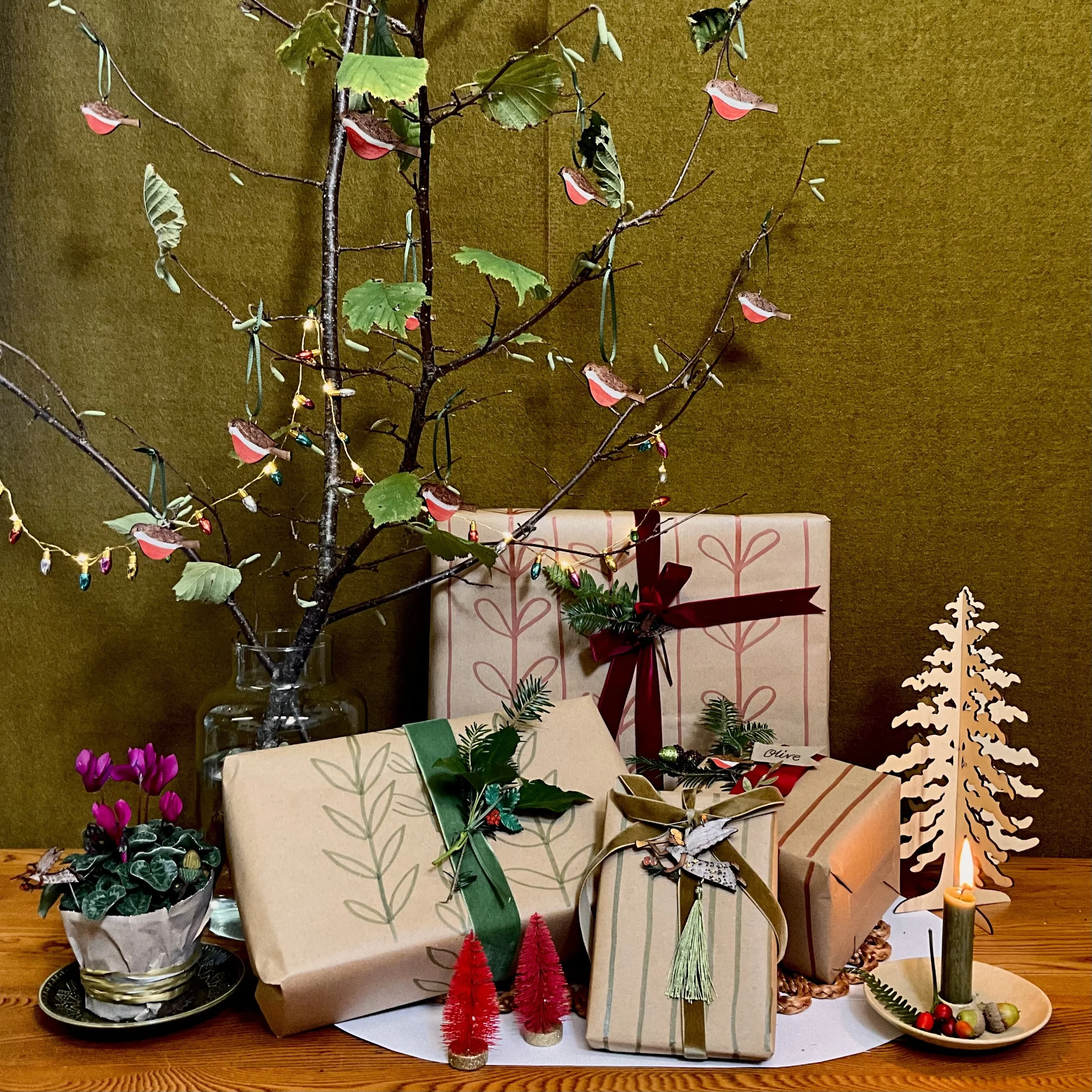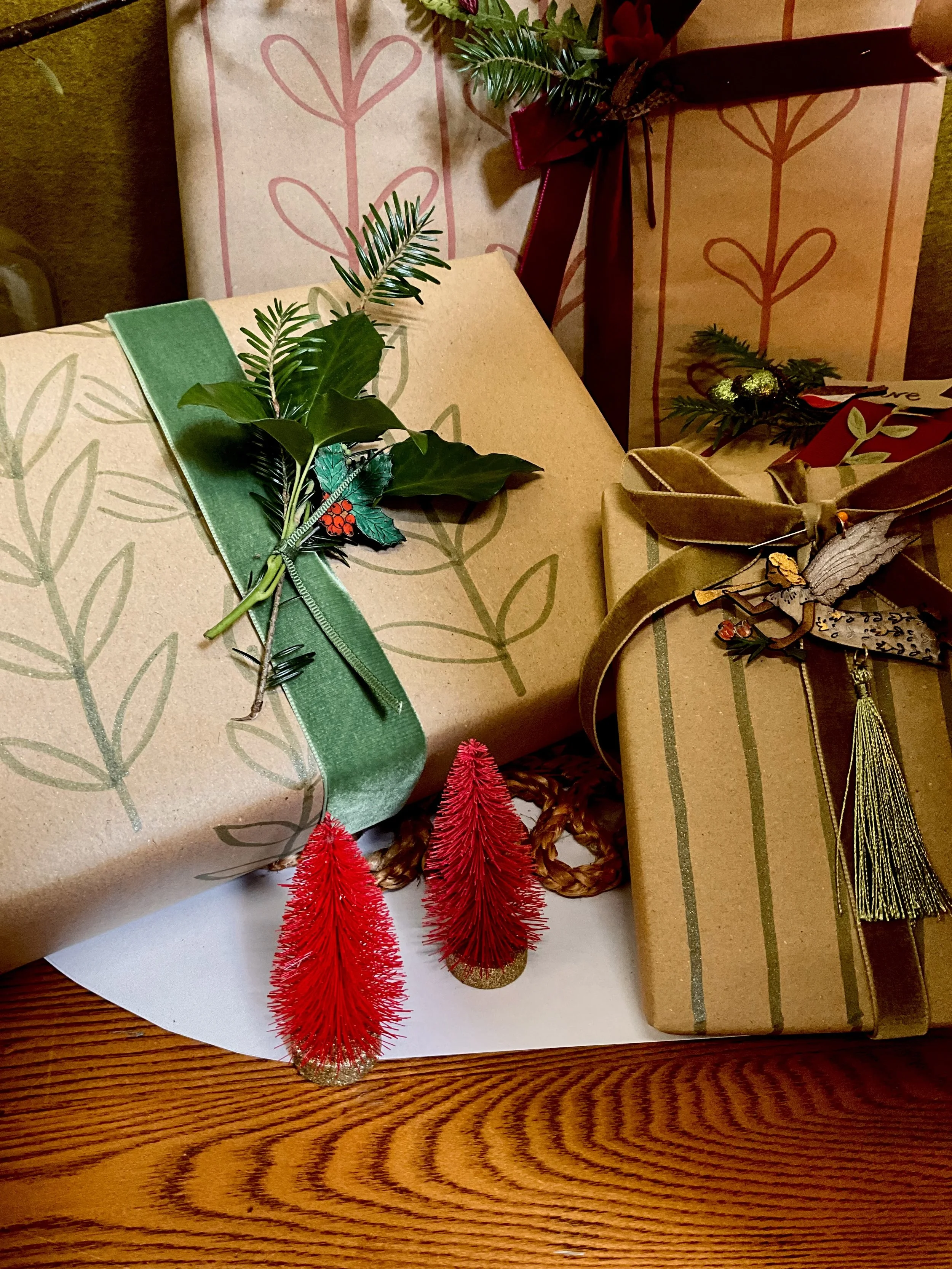 Once you’ve doodled to your hearts desire, wrap your gifts, and then comes the fun part of adding some finishing touches. Much like my paper stash, I have a ribbon one too. Collecting throughout the year, and sometimes purchasing some new lengths like these lustrous velvet ribbons from a local haberdashery. I love to add some sprigs of foliage, these were left overs from the weekends wreath making endeavours. But a few little snips from the garden or a hedgerow near by and you’re good to go. The addition of foliage to remind us of the ever revolving wheel of the year. Whilst collating my pieces, I noticed the starting buds of some willow, and the beginnings of next Springs catkins on the Hazel - and that is a hopeful thing in action.