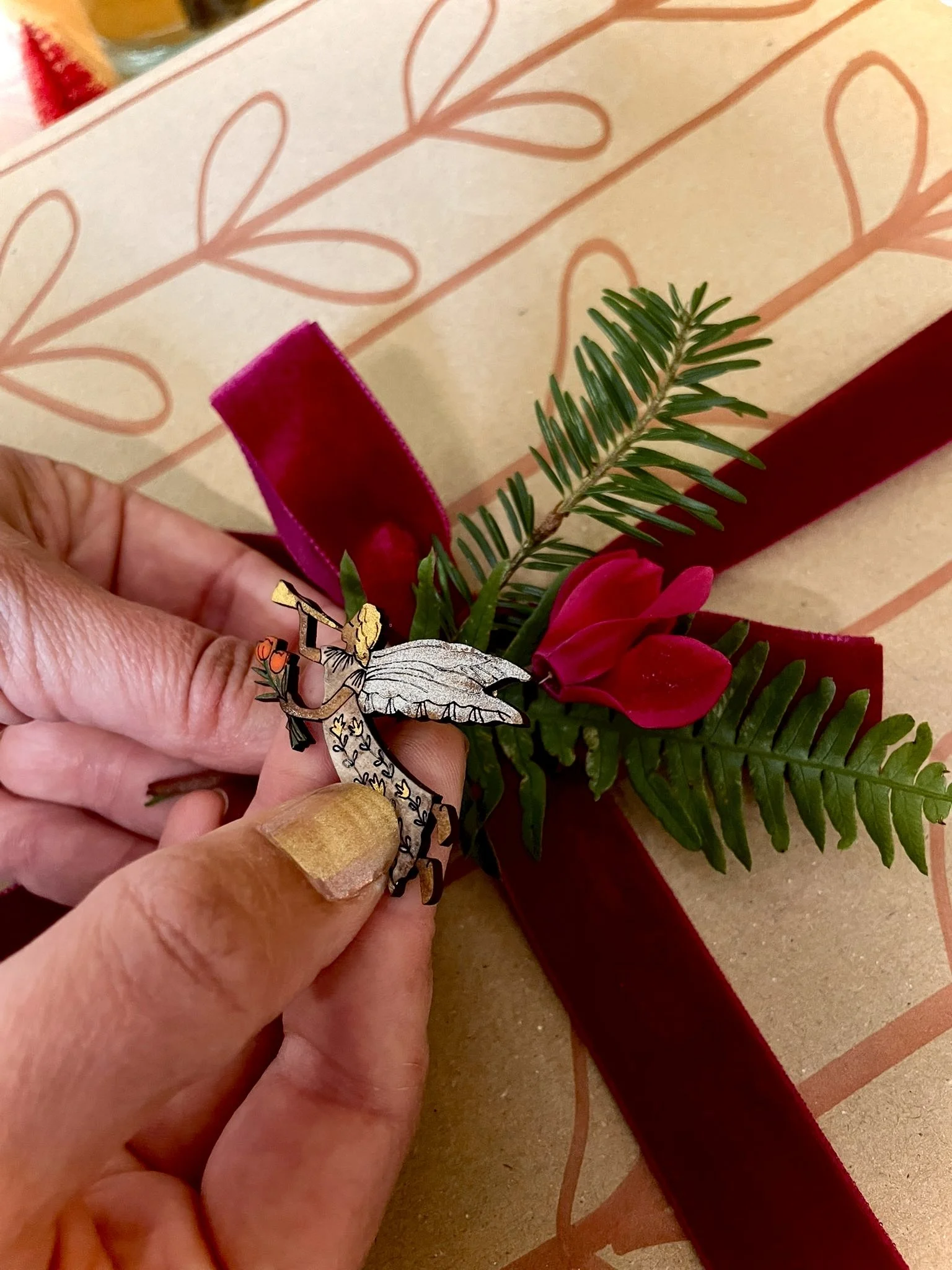 To keep everything in place, I quite often use a mini pin brooch, and this year the Angel pins, make a sweet and thoughtful addition. I like adding layers of surprise and delight to gift giving, part of the present can be on the exterior. This year we are mostly giving books to our loved ones, but there’s a tassel decoration adorning the outside of the gift, acting as a gift label.